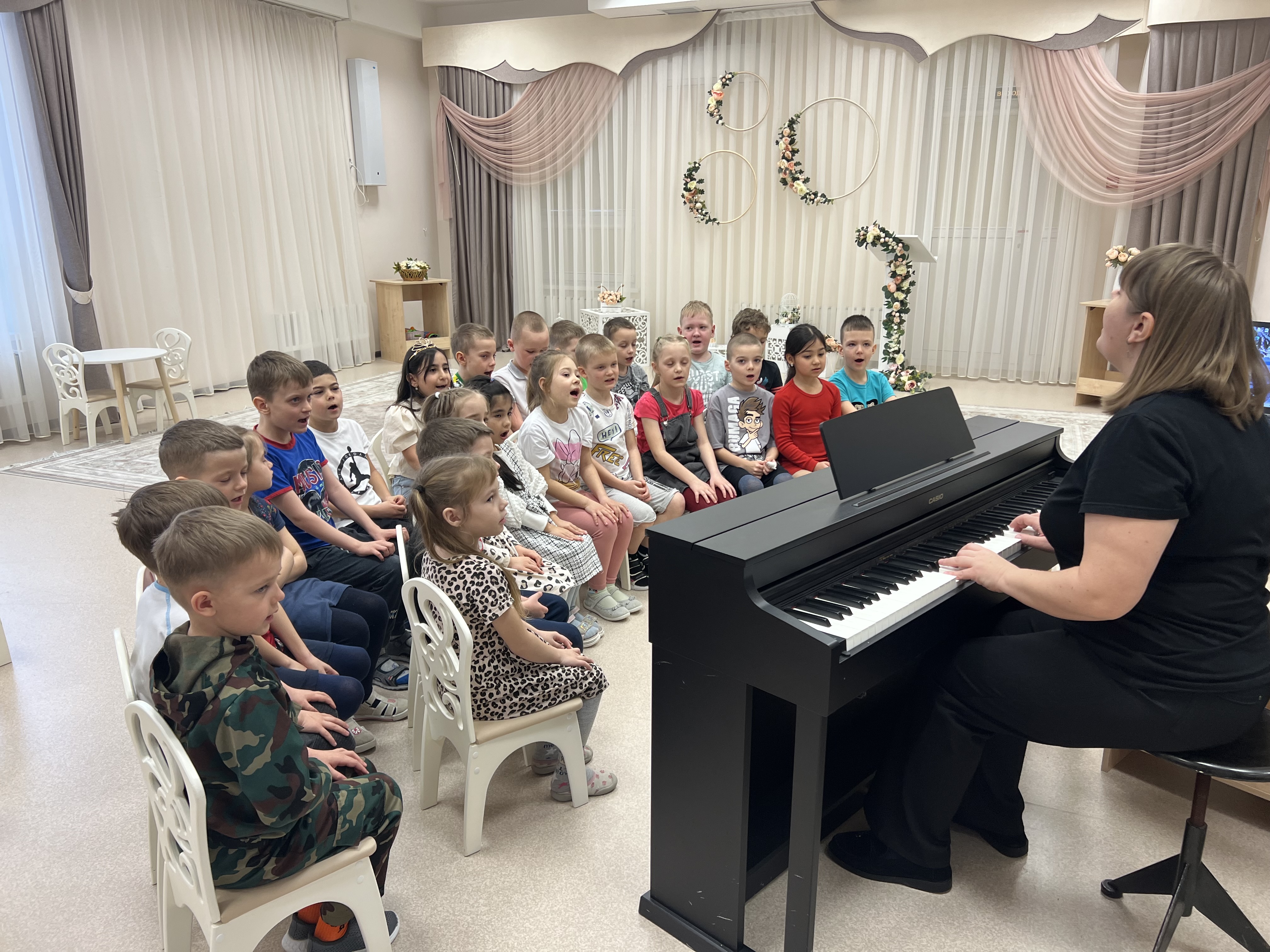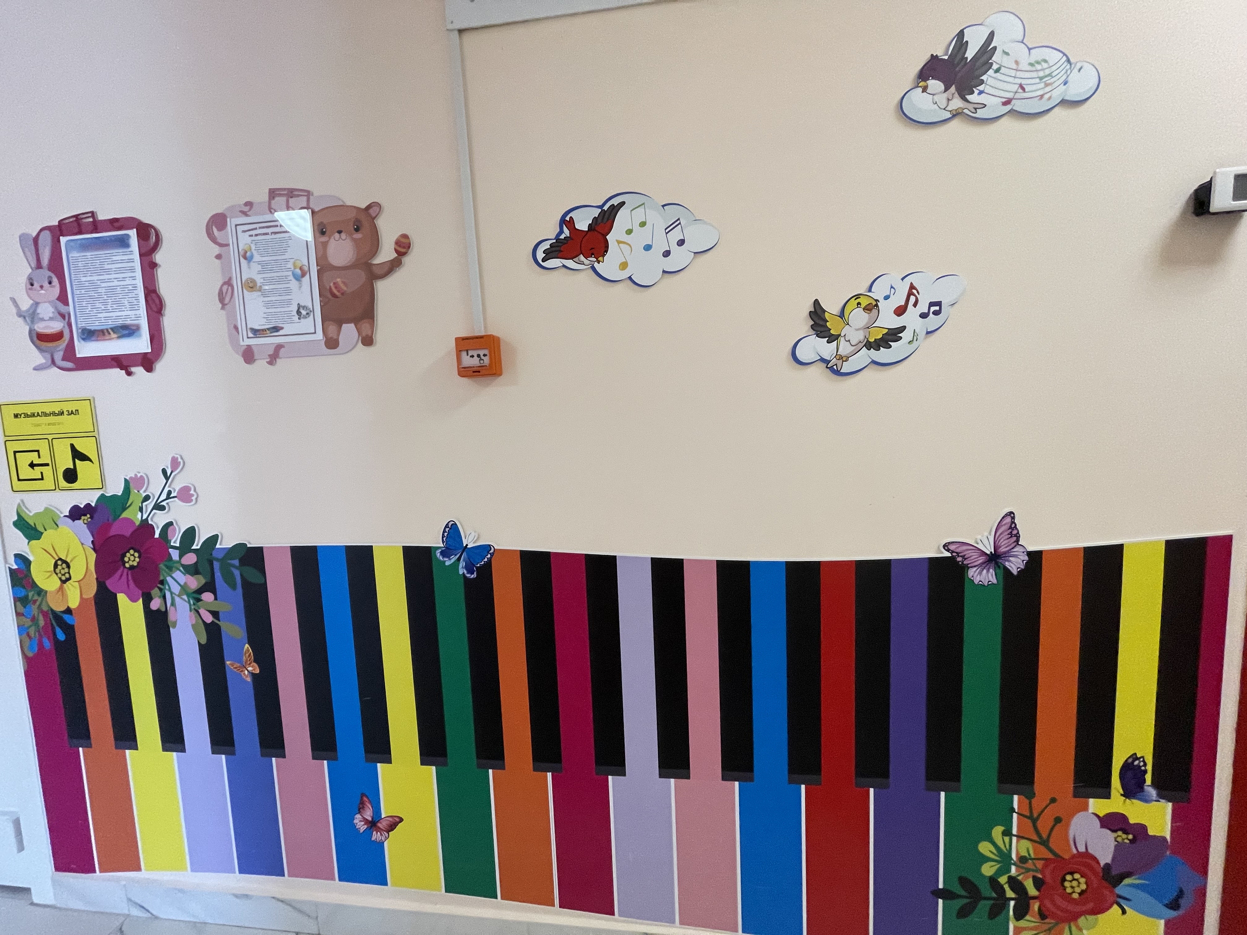 Оснащение: цифровое фортепиано, музыкальный центр, детские музыкальные инструменты, атрибуты для инсценировок, ширма, маски, материал к тематическому оформлению праздников; учебно-методическая литература, фонотека; стулья взрослые и детские.